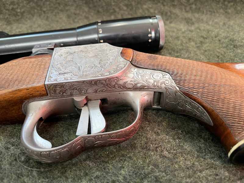 Zum Verkauf steht eine jagdliche Blockbüchse im klassischen Heeren-Fallblocksystem im Kaliber 5,6×52R (.22 Savage Hi-Power).