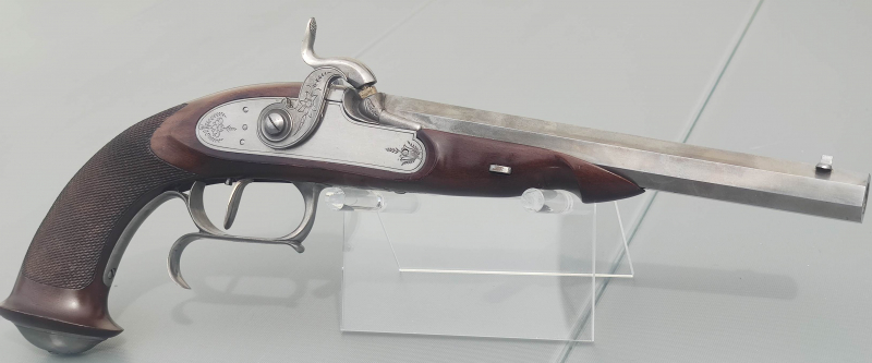 Wenig geschossene Le Page, Kal. 44, in gutem Zustand. Schloss- und Stecherfunktion sind bestens. Auch die Fischhaut am Griff ist noch nicht abgegriffen.