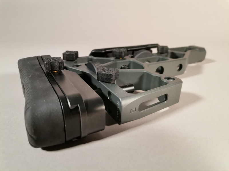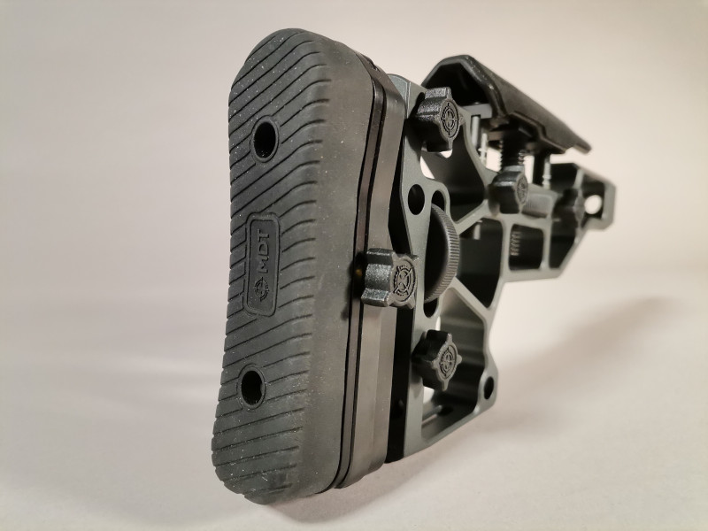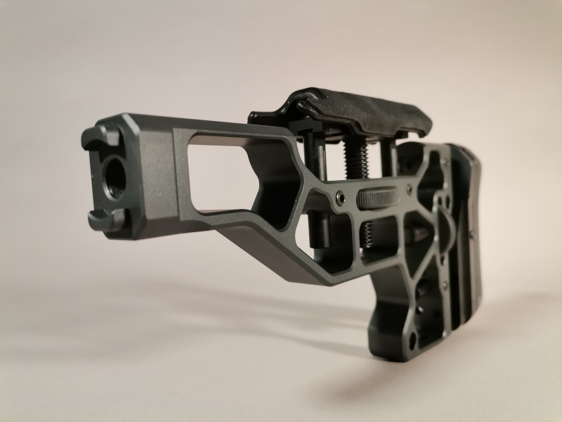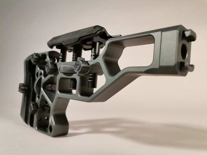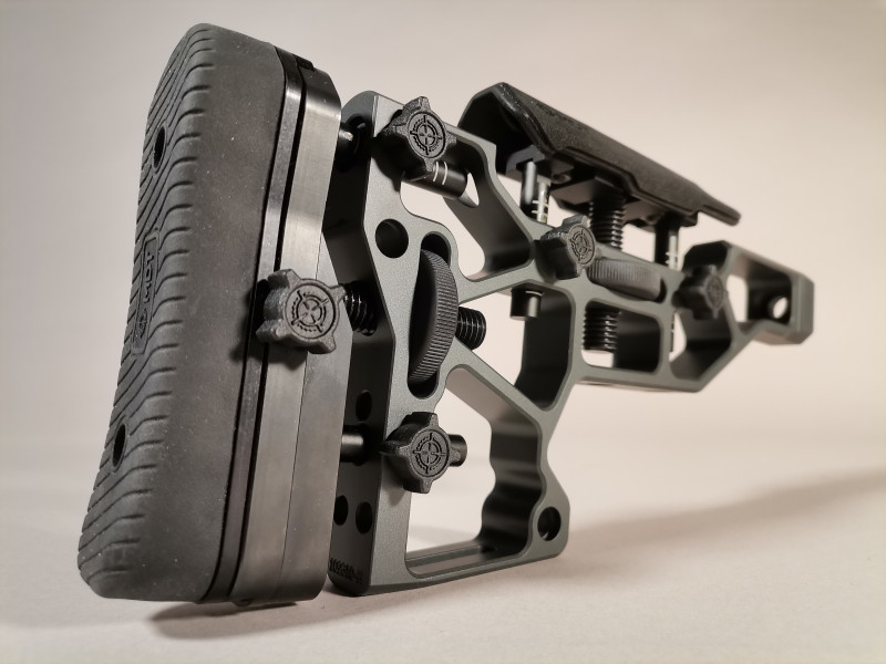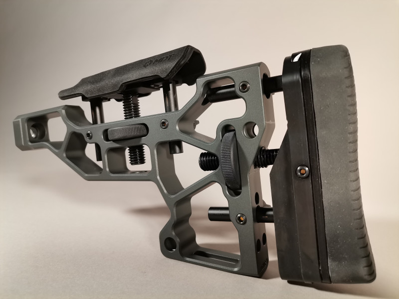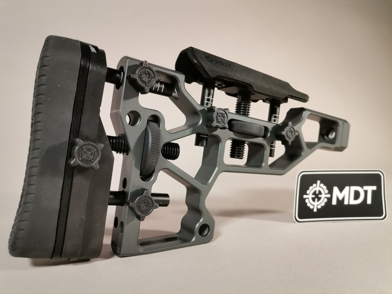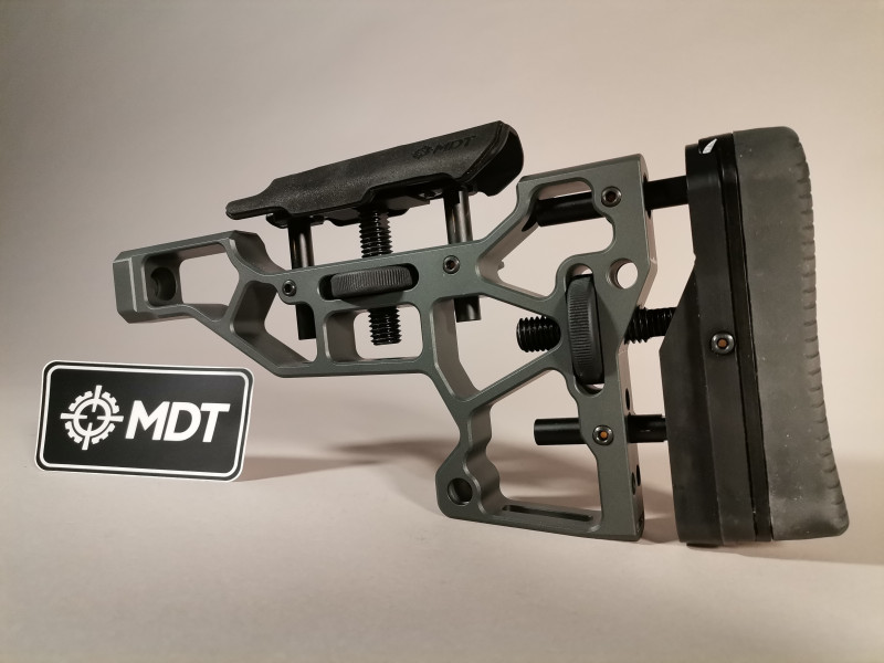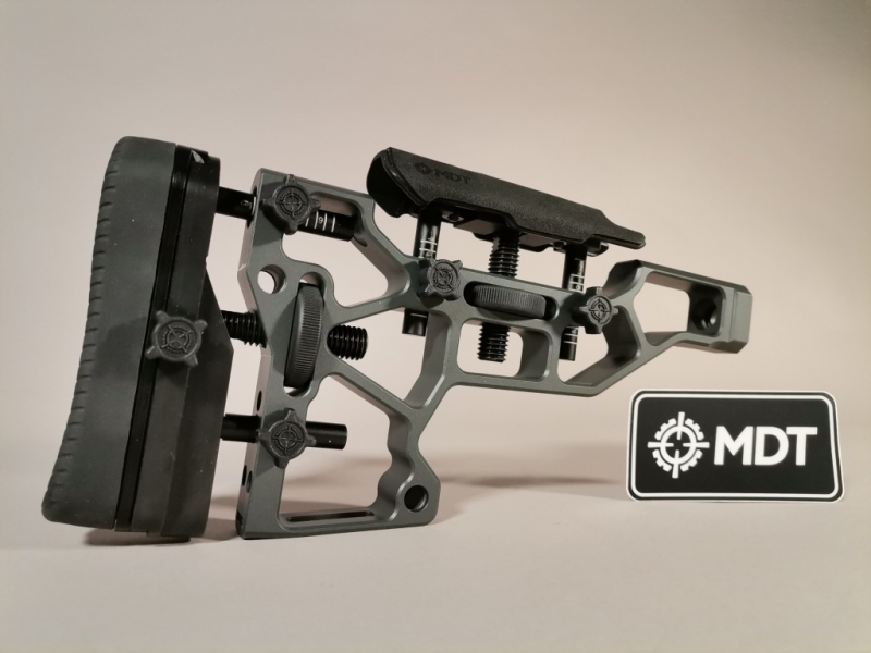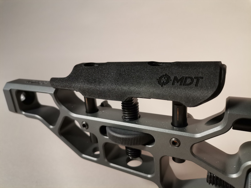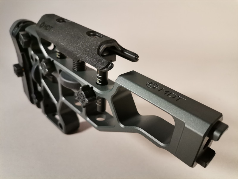 Der Hinterschaft ist von MDT selbst im Farbton „Elite Carbon Grey“ CERAKOTE beschichtet worden. Diese Variante wurde so niemals einzeln im Handel angeboten.