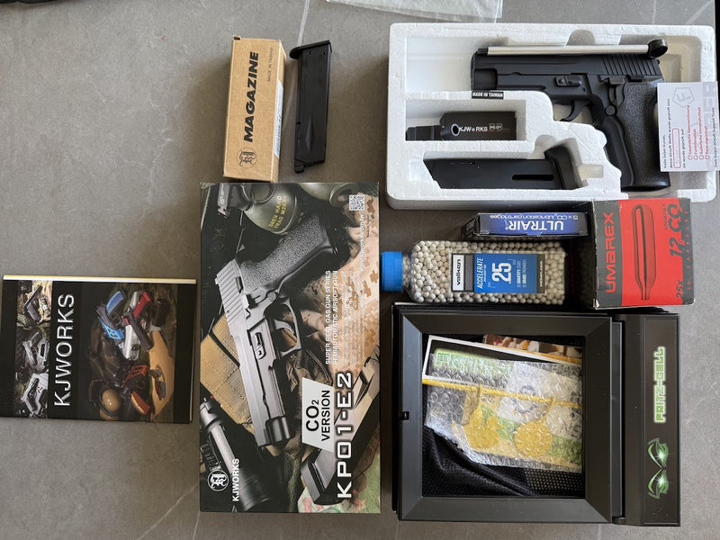 ich verkaufe hier ein unbenutztes und komplettes XXL-Starter-Set rund um die beliebte KJ Works P226 KP01-E2 (F26) Vollmetall-Pistole.