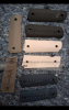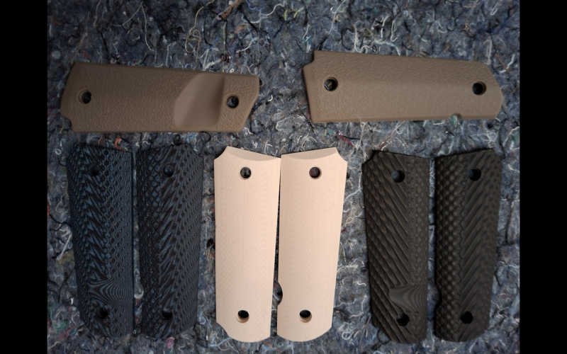 Vier paar Plaste Pistolen Griffschalen, vermutlich für Colt 1911. Mangels fehlender Waffe kann ich das mit Bestimmtheit nicht mitteilen. Ich messe von Mitte Loch zu Mitte Loch 78mm.