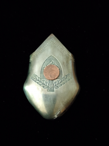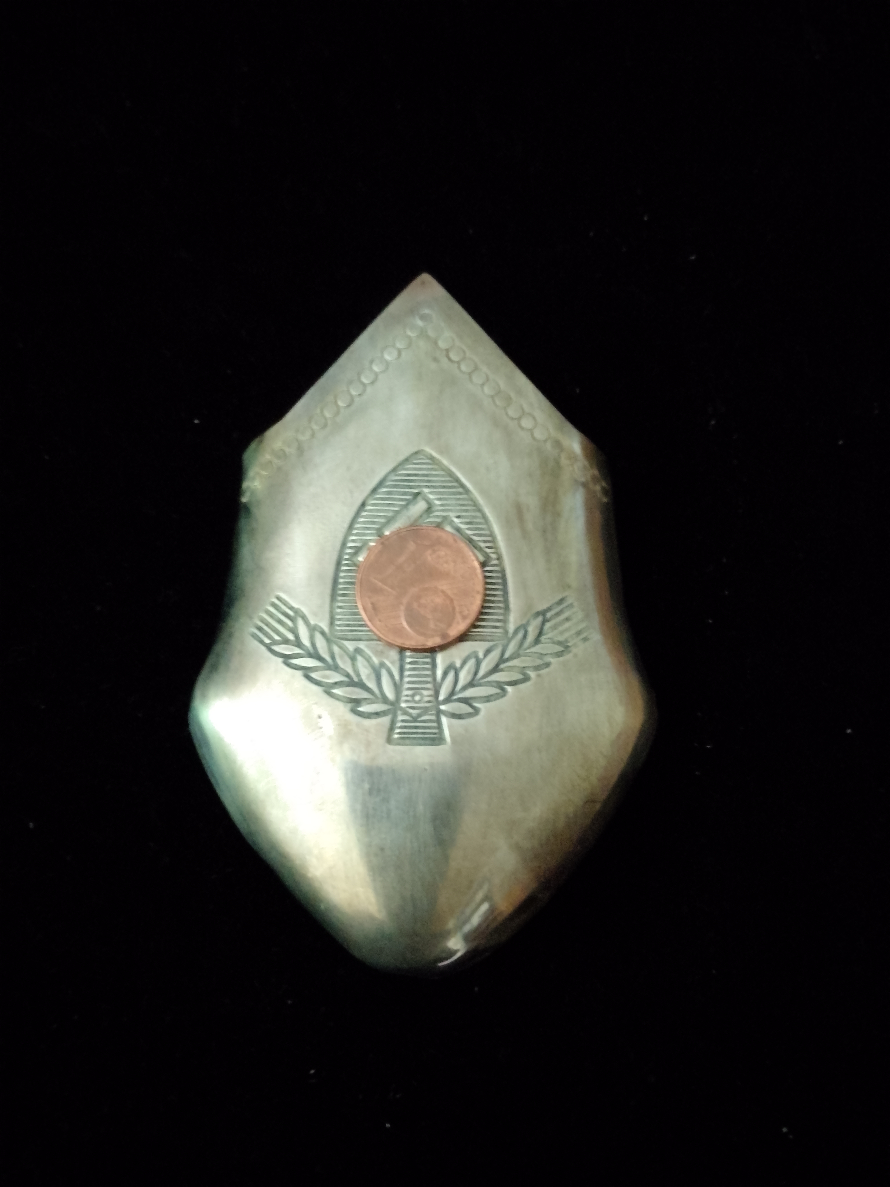 unterer Beschlag für einen Rad Hauer vermutlich tombak schwer versilbert, fein und detailliert geprägt, seitlich noch keine Löcher für Schrauben vorhanden, infolgedessen also noch nie verbaut, vermutlich aus Altbestand gesuchtes Ersatzteil.