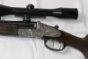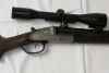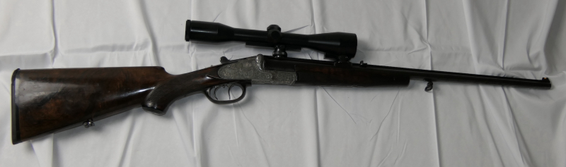 Vorkriegsseitenschlosskipplaufbüchse Krieghoff Suhl im Kaliber 9,3x72R. Lauf gutes Feld-Zug-Maß. Auf 9,3x74R aufreibbarer doppelter Laufhaken und einfacher Greener. Deutscher Stecher. 60cm Rundlauf mit durchgehender Schiene. Basküle auf der linken Seite mit leichten Rostnarben vom Verstecken. Rechte Seite perfekt ohne Rostnarben. Sehr schönes Holz. Hornabzugsbügel. 36cm Schaftlänge. Zielfernrohr Carl Zeiss Jena 6x42 mit Absehen 1 und Schwenkmontage.