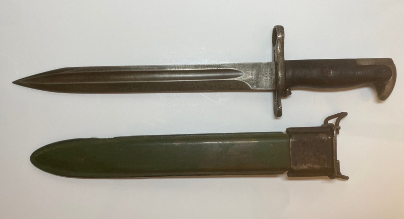Amerikanisches Bajonett aus dem Zweiten Weltkrieg für das Gewehr M1 Garand, hergestellt von AFH (American Fork & Hoe Co.) im Jahr 1942.