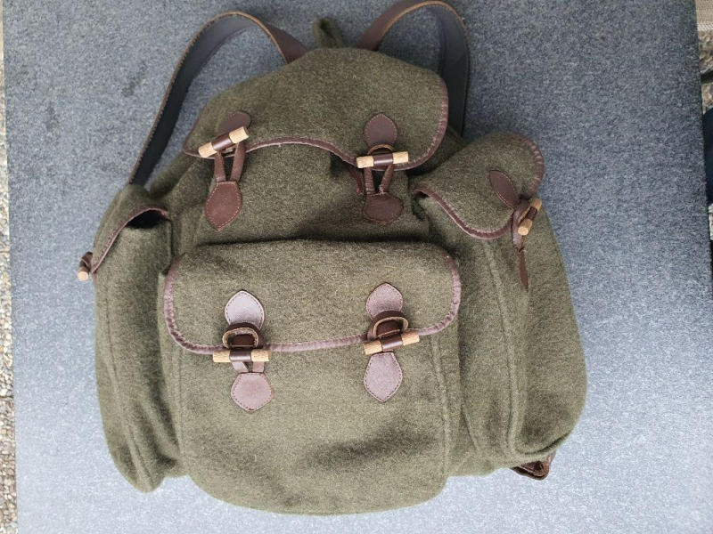 Sie bieten auf einen gebrauchten Loden Jagdrucksack mit ausknüpfbarer gummierter Schweißeinlage. Der Rucksack ist absolut geräuschlos und weist altersbedingt leichte Abnutzungserscheinungen an den Rändern der gummierten Rückseite der Trageriemen auf. Die Taschen werden durch hölzerne Stäbchen verschlossen. Die Rückseite des Rucksackdeckels ist ebenfalls gummiert.