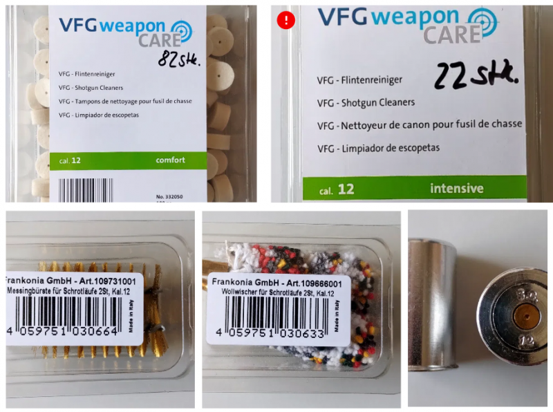 Flintenreinigungsset Pufferpatronen Kal. 12: VFG, Stil Crin Filzreiniger, Messingbürsten