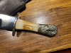 Biete hier ein älteres Sheffield Style Bowiemesser an. Mein Vater hatte es mal in den 80ern gekauft. Stammt wohl ursprünglich aus England. Es ist 36,8cm lang Klingenlänge 25,3cm die Klinge ist 4mm stark. Die Klinge ist Hochglanz poliert, das Parrierelement und der Griffabschluss mit Pferdemotiv sind wohl aus Neusilber der Griff selbst aus Knochen. Es hat auf der rechten Klingenseite leider 2 Rostflecken obwohl Stainless Steel darauf steht. Wahrscheinlich steckte es in der Original Scheide, deswegen die 2 kleinen Punkte. Die Original Scheide gibt es nicht mehr hatte vor längerem ein Scheide aus 3mm Leder dafür machen lassen. So bei Fragen einfach melden, der Verkauf ist frei ab 18 Jahren. Bitte Altersnachweis nach Auktionsende per Mail oder egun ID. Viel Spass beim bieten.........