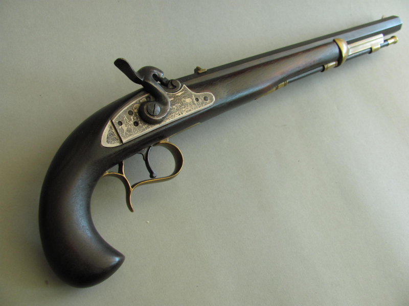Aus einer Sammlung biete ich diese seltene Bounty Hunter Pistole an. Die Pistole zeigt altersbedingte Gebrauchsspuren, ist aber für ihr Alter in einem sehr schönen, gepflegten Zustand. Der 38 cm lange Lauf ist ohne Rost und die Mechanik arbeitet einwandfrei. Die Pistole besticht durch ihr authentisches Finisch und die schöne Ätzgravur auf der Schlossplatte. Die Gesamtlänge dieser Pistole beträgt beeindruckende 50 cm.