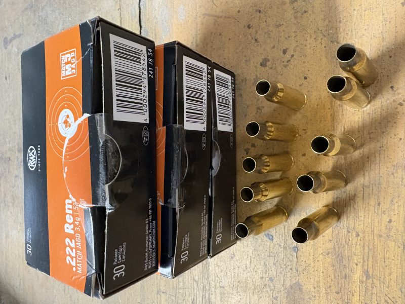 Sie bieten auf 100 Stück einmal aus einer Büchse abgeschossene Kaliber .222 Remington RWS Hülsen.