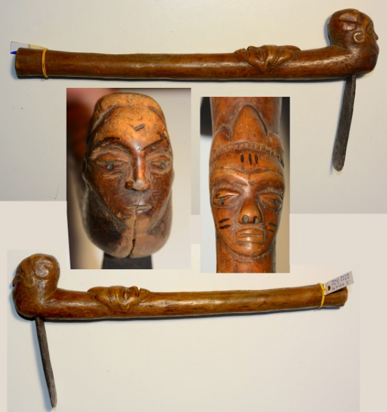Afrikanische Streitaxt oder eventuell auch Hacke, die Beilklinge quer montiert, am Beilkopf und oben am Stiel Gesicht eingeschnitzt, Stiel 37,5cm, Beilklinge 10,1 cm