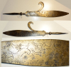 Klinge von afrikanischem Spieß, bis zu 5 cm breites Blatt mit seitlich ausgeschmiedeter Hakenklinge, Länge des Blatts 38,3 cm, Gesamtlänge 54,2 cm, an der Spitze fehlen einige Millimeter, Blatt mit Ziergravur, guter Zustand mit Alterspatina