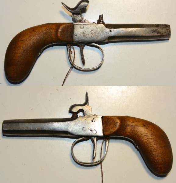 Perkussionsterzerol , Lauflänge 66mm, Gesamtlänge 17,3cm, Kaliber 9,7 mm, der Griff überarbeitet und am Lauf vorne wohl Rostnarben ausgefeilt, keine Markierungen, technisch völlig im Ordnung