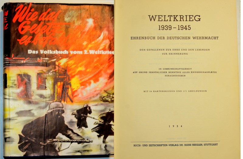 Buch "Wie das Gesetz es befielt - das Volksbuch vom 2. Weltkrieg", Verlag Hans Riegler Stuttgart 1954, Hardcover mit ca. 400 Seiten (das Buch hat viele Kapitel, die immer wieder neu mit 0 beginnen, so dass die Seitenzahl aufwändig zu ermitteln ist), Wiedergabe von Originalfotos, Frontverläufen und Heeresbewegungen, der Schutzumschlag mit leichten Gebrauchsspuren ansonsten guter Zustand