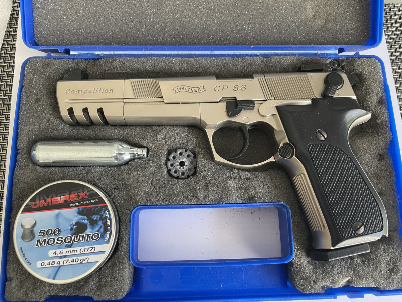 Angeboten wird hier eine Walther CP88 Competition (F) mit Koffer, eine CO2 Kartusche und ca. 100 Diabolos. Die Pistole ist schon ein paar Jahre alt aber, für mich, in einem s. guten Zustand. Seitdem die Pistole gebraucht gekauft wurde, habe ich vielleicht 5 Magazine verschossen. Da ich ein Luftgewähr gekauft habe, liegt sie nur im Schrank. Kein Versand ins Ausland! Irrtümer und Druckfehlervorbehalten.