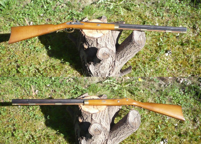 Nachbau eines US Frontier Hawken Rifle. Hergestellt in Spanien von der Fa. Dikar (bekannt für solide Qualität und gute Präzision). Natürlich mit gültigem Beschuss. Die Waffe wurde augenscheinlich wenig geschossen und hat einige Gebrauchsspuren und z. T. minimalen Flugrost. Der gezogene 8-Kantlauf im Kaliber .45 ist aushakbar und innen in prima Zustand. Der Piston ist nicht verschlagen, die Gewinde in Ordnung. Klassisches Visier. Das sehr schöne, buntgehärtete Schloß weist zwei Besonderheiten auf. Zum einen in Gegensatz zu den normalen Dikar Schlössern besitzt dieses einen Studel (Widerlagerbrücke für die Nuss/Hahnachse). So sind auch klassische Schlösser verbaut, somit verbessertet Schloßgang und Langlebigkeit. Zum anderen wird der Hahn normal in die Laderast gebracht, dann muss der Stecher betätigt werden um in die Feuerrast zu spannen. Die Beschlagteile sind aus Messing, der rissfreie Schaft hat eine schöne Maserung und nur leicht Gebrauchsspuren. Als Zugabe gibt es noch eine Pulverflasche, einen Pistonschlüssel und eine Patchbox. Diese kann nach Belieben noch selbst in den Schaft eingebaut werden. Die Waffe wird zerlegt geliefert, zur Montage ist nur ein Schraubenzieher nötig.