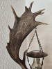 Die Lampe besteht aus einem großen, sehr dekorativen Schaufelgeweih, das als tragendes Gestaltungselement dient. Daran hängt eine kleine Laterne mit Kettenaufhängung, kupferfarbigen Metallelementen und strukturiertem Glas. Die Kombination aus Geweih, Laterne, geschwungenem Metallfuß und warmem Licht ergibt ein sehr stimmungsvolles Gesamtbild – ideal für Jagdzimmer, Landhaus, Chalet, Hütte, Kaminzimmer, rustikale Einrichtung oder als auffälliges Deko-Objekt.