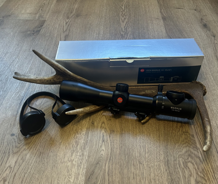 Verkaufe wegen Überbestand dieses Leica Magnus 1,5-10x42i mit Zeiss-Schiene inkl. Linsenschutz und Schnellverstellhebel sowie Originalverpackung. Absehen L4A. Linsen sind frei von Kratzern und auch das Gehäuse hat keine Beschädigungen nur an einer Stelle 3-4 kleine Kratzer vom ablegen auf der Brüstung (siehe Bild). Vergrößerungverstellung, Dioptrienausgleich und Leuchtpunkt funktionieren tadellos. Die im Bild zu sehende Montage von Merkel zum Beispiel für die K5 ist nicht Teil des Angebots, kann aber separat erworben werden.