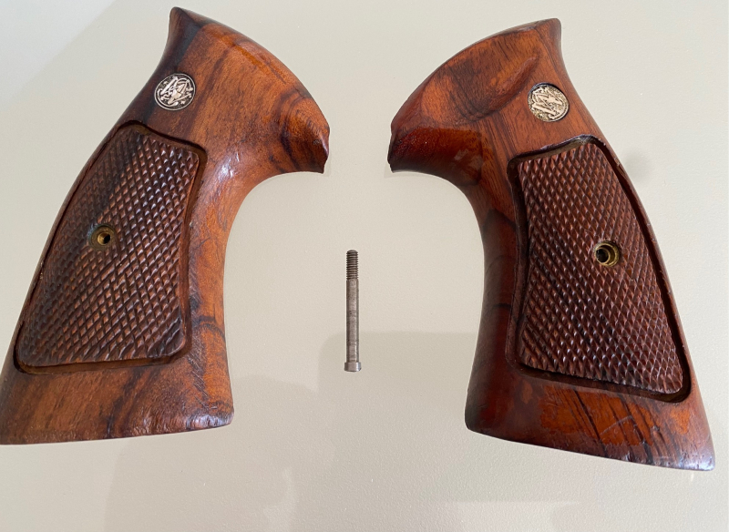 Smith & Wesson lieferte Ihre Revolver bis etwa 1994 standardmäßig mit diesen originalen Holzgriffschalen, welche aus eigener S&W Fertigung stammen, genau so aus.