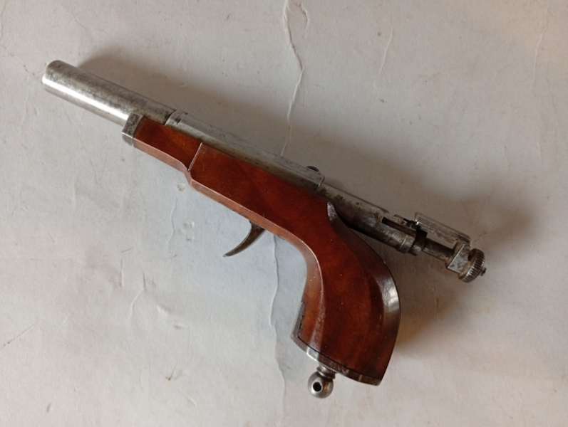 Kleine Probestreife, Nadelverschluss, Kaliber ca. 7,5 mm. Vierkantiger Verschlusskasten. Schlagbolzen mit verschiedenen Positionen zum Öffnen des Verschlusskastens und zum Abfeuern. Klappabzug. Glatter Lauf. Schaft aus Nussbaumholz, kantig, flache Kalotte mit Ringhalterung. Länge: 14 cm. Nadel vorhanden.