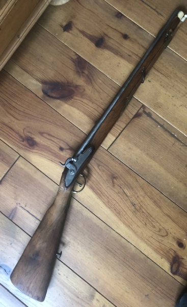 Kurze Flinte, Perkussion, Gesamtlänge 89cm, Lauf ohne Schwanzschraube 51,5cm, Durchmesser an der Mündung 1,8cm, Waffe wurde leider vom Vorbesitzer befummelt, trotzdem ein handliches schönes Objekt!