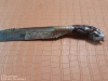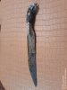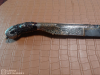 Sehr Dekoratives Messer, meiner Internetrecherche nach aus dem 18 - 19 Jahrhundert, könnte auch Früher sein. Das Messer hat eine Silbermontage (geprüft) Vergoldungen, wobei ich nicht ausschließen kann das es sich bei der Klingeneinlagen um Echtgold handelt. Im Griff ist wahrscheinlich Horn verarbeitet, sieht fast aus wie Bernstein, gehe ich aber nicht von aus.