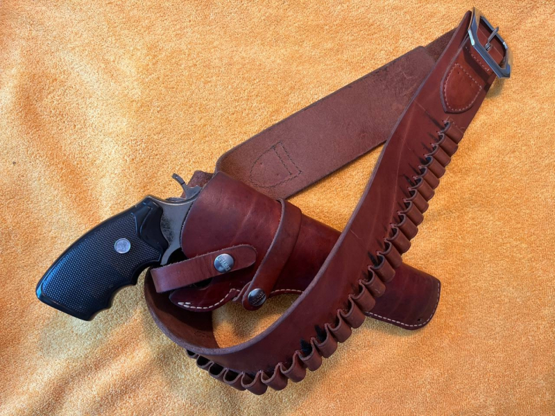 mit Platz für 25 Patronen (also was für 5- schüssige Revolver?), die mind. im Kal. 44Mag oder 45 sein müssen, da die dabei abgebildete Dekopatrone im Kal. 357Mag. fällt fast durch und dient nur als Vorstellung der Größe. Das Holster ist geschlossen am Lauf, ermöglicht aber die Aufnahme von Großevolver mit einer Lauflänge bis 6,0-6,5 Zoll. Als Beispiel ein Modell eines Colt SAA, der immer noch zu klein ist; im Titelbild mit einem etwas besser passenden Modell des Colt Python.