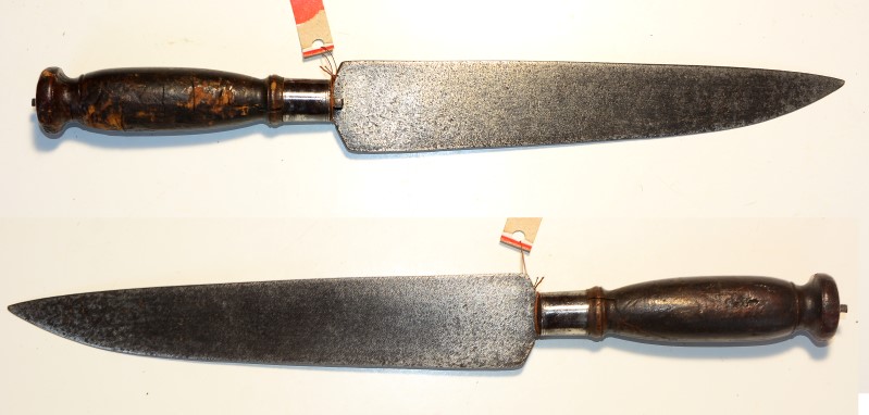 Afrikanisches Messer, dunkler Holzgriff und 23cm lange keilförmige Klinge, die Klinge alte Rostpatina, der Griff mit stärkeren Gebrauchsspuren