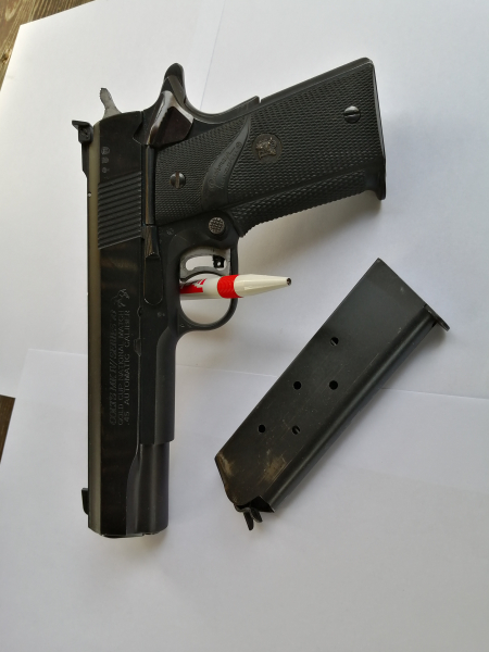 Verkaufe im Auftrag eines Schützenkollegen eine Colt Gold Cup Kal. .45 ACP.Die Pistole hat geringe Gebrauchsspuren und wurde nie in Wettkämpfen geschossen. Es sind Pachmeyer Griffe montiert. Hervorragender überarbeiteter Abzug. Box anbei, aber nicht original. Privatauktion, keine Garantie oder Rücknahme. Kein Versand ins Ausland.