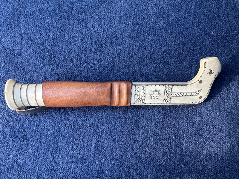 Biete hier dieses alte sehr gut erhaltene Sami oder Finnenmesser zum Verkauf an. Die Messerscheide ist sehr schön graviert, und auf der rückseite signiert. Die Gesamtlänge des Messers ist 22,5 cm. die Klingenlänge ist 9,7 cm. Das Messer befindet sich in einem sehr guten Zustand, und ist unbeschädigt.