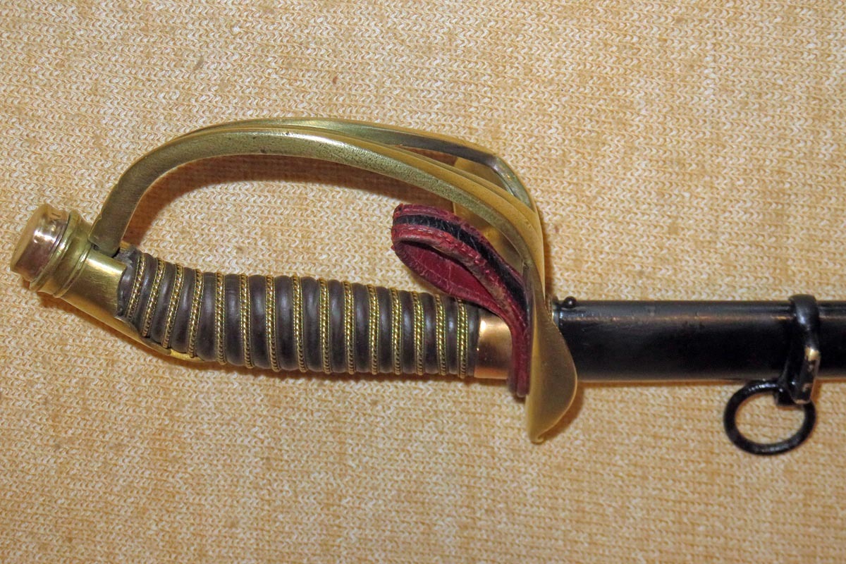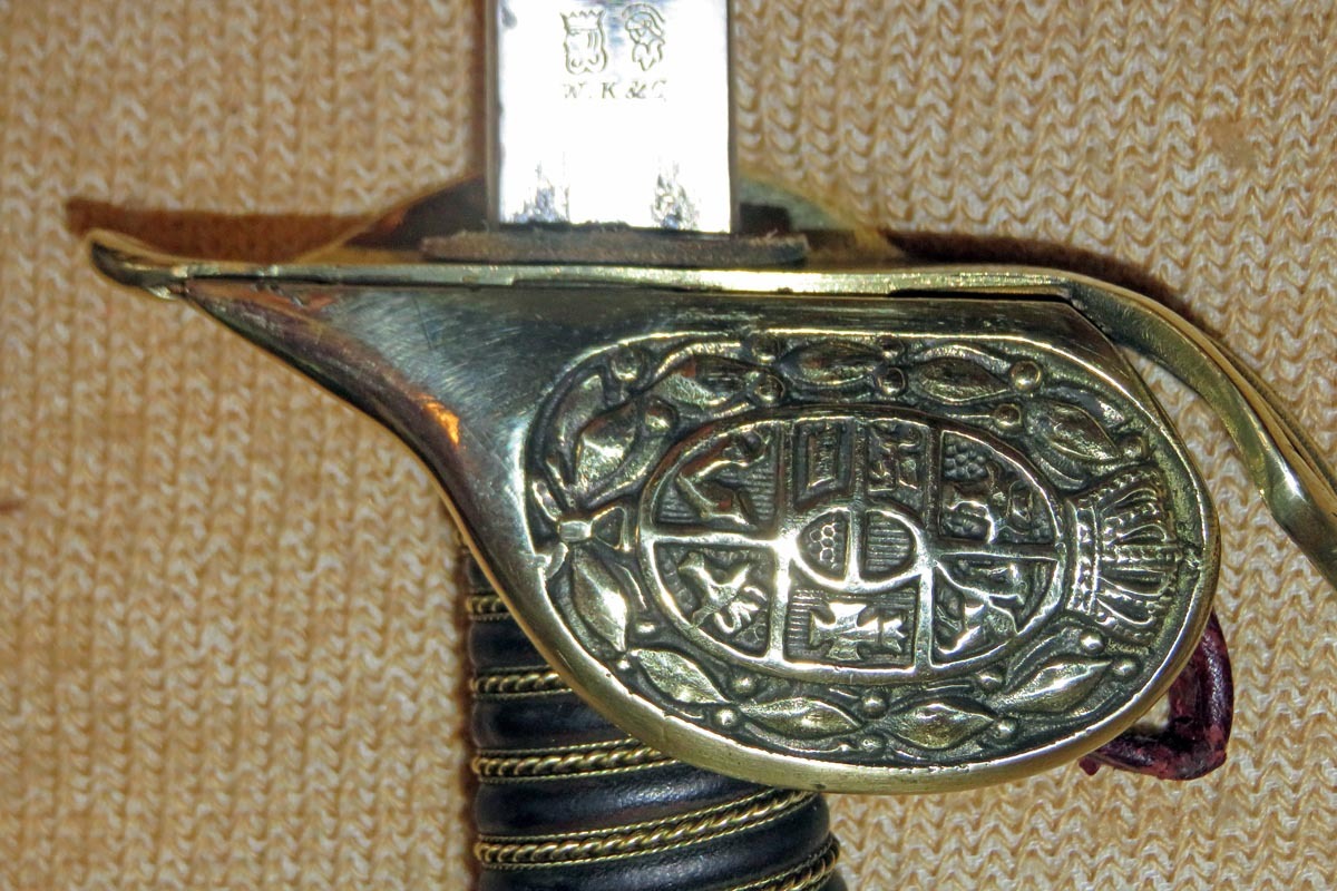 Das Gefäß ist hier mit Klappscharnier und Wappen von Mecklenburg-Schwerin, mit Fingerschlaufe, der Griff ist mit Leder überzogen und die Griffwicklung erneuert.