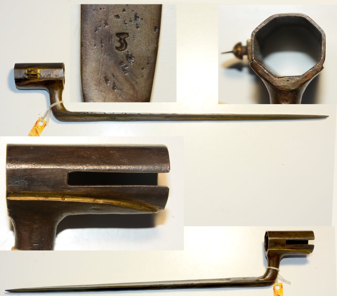 Tüllenbajonett geändert für Achtkantlauf, gegenüberliegende Laufflächen ca. 24mm Außenabstand, linke Seite Klemmschraube und rechte Seite 5mm breiter und 34mm langer Schlitz, Klingenlänge 32,8cm, markiert mit "3"