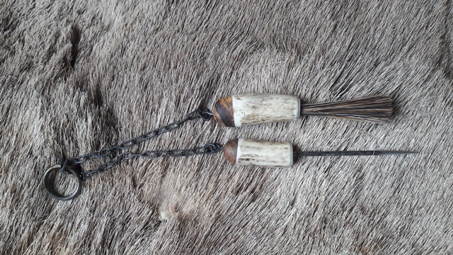Vorderlader Reinigungs Set für Steinschloss Waffen, Pfannenbürste und Zündlochnadel, hangeschmiedet, Bürste aus Keiler-Kurzwildbret, Nadel cca 11 cm lang, Gesamtlange cca 20 cm. / Cleaning set for flintlock guns, pan brush from wild boar bristles, handforged vent pick cca 1 cm long, total lenght ca 20 cm.