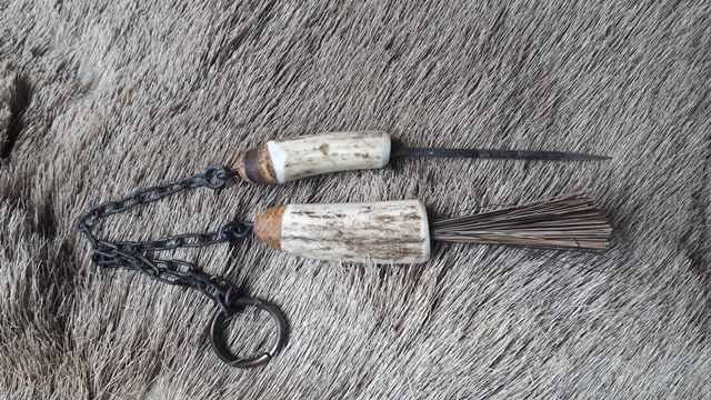 Vorderlader Reinigungs Set für Steinschloss Waffen, Pfannenbürste und Zündlochnadel, hangeschmiedet, Bürste aus Keiler-Kurzwildbret, Nadel cca 11 cm lang, Gesamtlange cca 20 cm. / Cleaning set for flintlock guns, pan brush from wild boar bristles, handforged vent pick cca 1 cm long, total lenght ca 20 cm.