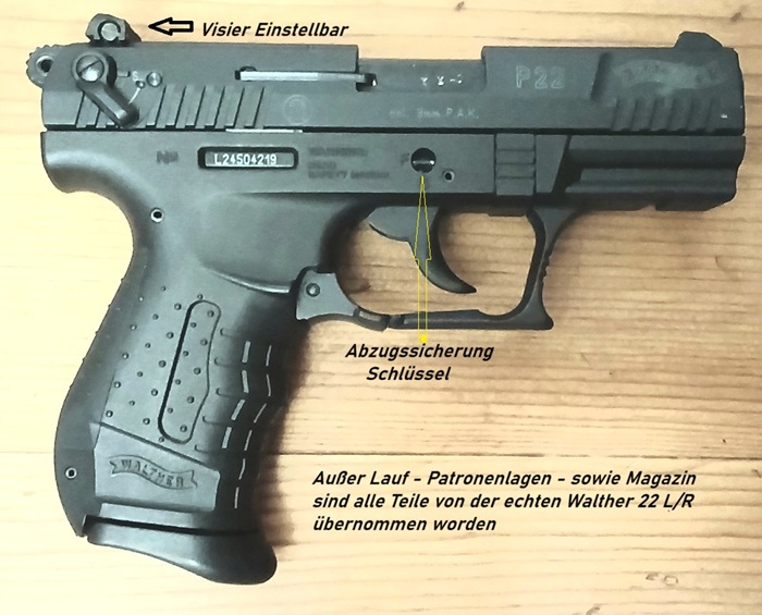 Zum Verkauf steht hier eine der ersten und besseren PTB Waffen der 22iger Serie. Diese Waffe hat noch alle Bedienelemente der echten 22iger. Die Visierung ist verstellbar und hat noch die weißen Zielhilfepunkte. Der Abzug ist mit einem Schlüssel abschließbar. Der Schlüssel liegt bei. Die Brünierung ist auch besser als bei den jetzigen Modellen. Man könnte hier schon behaupten, dass dieses Model aus der scharfen Waffe konvertiert wurde. Vom Aussehen gibt es abgesehen von Kleinigkeiten am Patronenlager kaum einen Unterschied. Der Lauf, das Patronenlager und das Magazin ist natürlich anders. Die Laufsperre sitz noch ein wenig nach hinten, so das man die Sperre nicht genau wahrnehmen kann. Bei trüben Wetter und Nachts sowieso nicht. Diese Waffen aus den Anfängen der PTB 22iger Baureihe sind sehr selten noch zu bekommen. Der Unterschied zu den heutigen 22iger PTB Modellen ist schon groß. Hier hat man das Gefühl eine scharfe 22iger in der Hand zu halten. Die Waffe ist sauber, geölt, und in einem top Zustand. Geschossen ist mit Ihr nicht viel. Geliefert wird diese in einer kleinen Holzkiste mit einem Klemmholster. Siehe Bilder. Ein Sofortkauf ist für mich ehrlicher als das kuriose Bieten und doch nicht kaufen wollen.