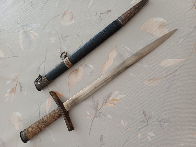 Biete aus einer Sammlungsauflösung einen HJ-Führerdolch an. Hersteller Hörster, Solingen (RZM 7/36). Die Devise ist gut zu erkennen und die Klinge ist unbeschliffen. Die Scheide ist beledert mit Beschlägen, oberer Beschlag mit HJ-Adler. Feine unbeschädigte Drahtwicklung am Griff. Privatverkauf ohne Rückname und Garantie