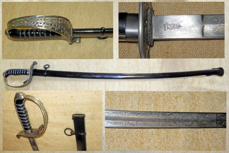 Die Klinge ist beidseitig reich verziert und mit dem Wappen von Baden versehen, unbekannter Herstellernamen.