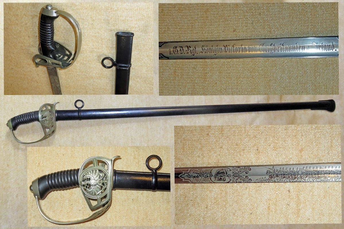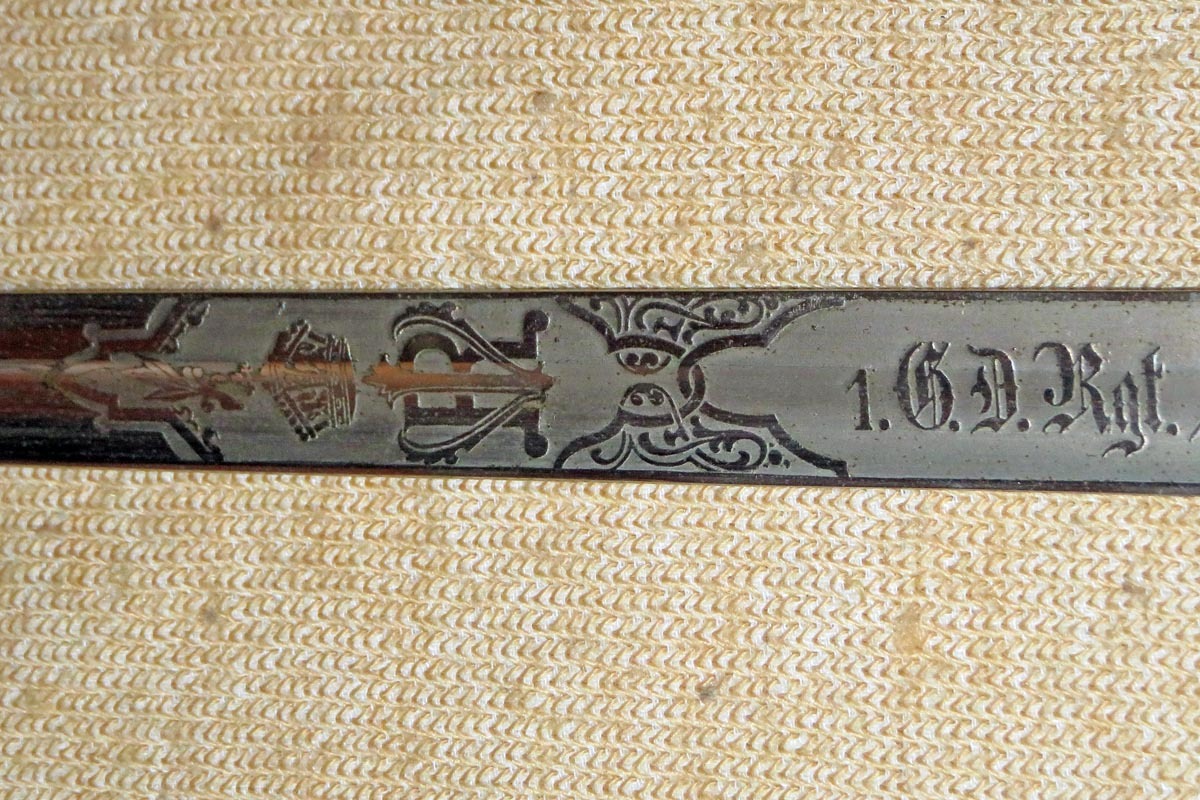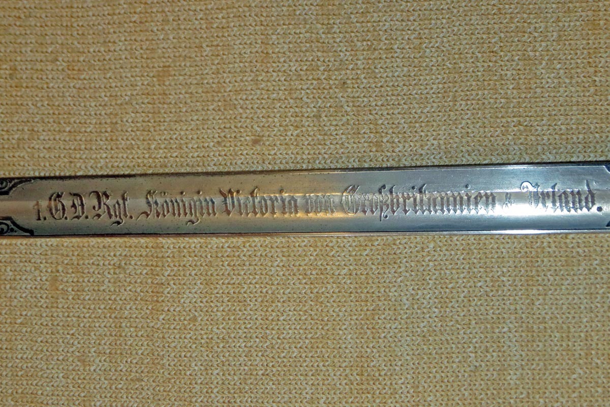Der Kavallerie Degen hat auf der gut erhaltenen Klinge eine beidseitig reiche Ätzung mit der Inschrift des 1. Garde Dragoner Regiments „1.G.D.Rgt. Königin Victoria von Großbritannien & Irland“ und die Herstellerbezeichnung „W.K.&C.“.
