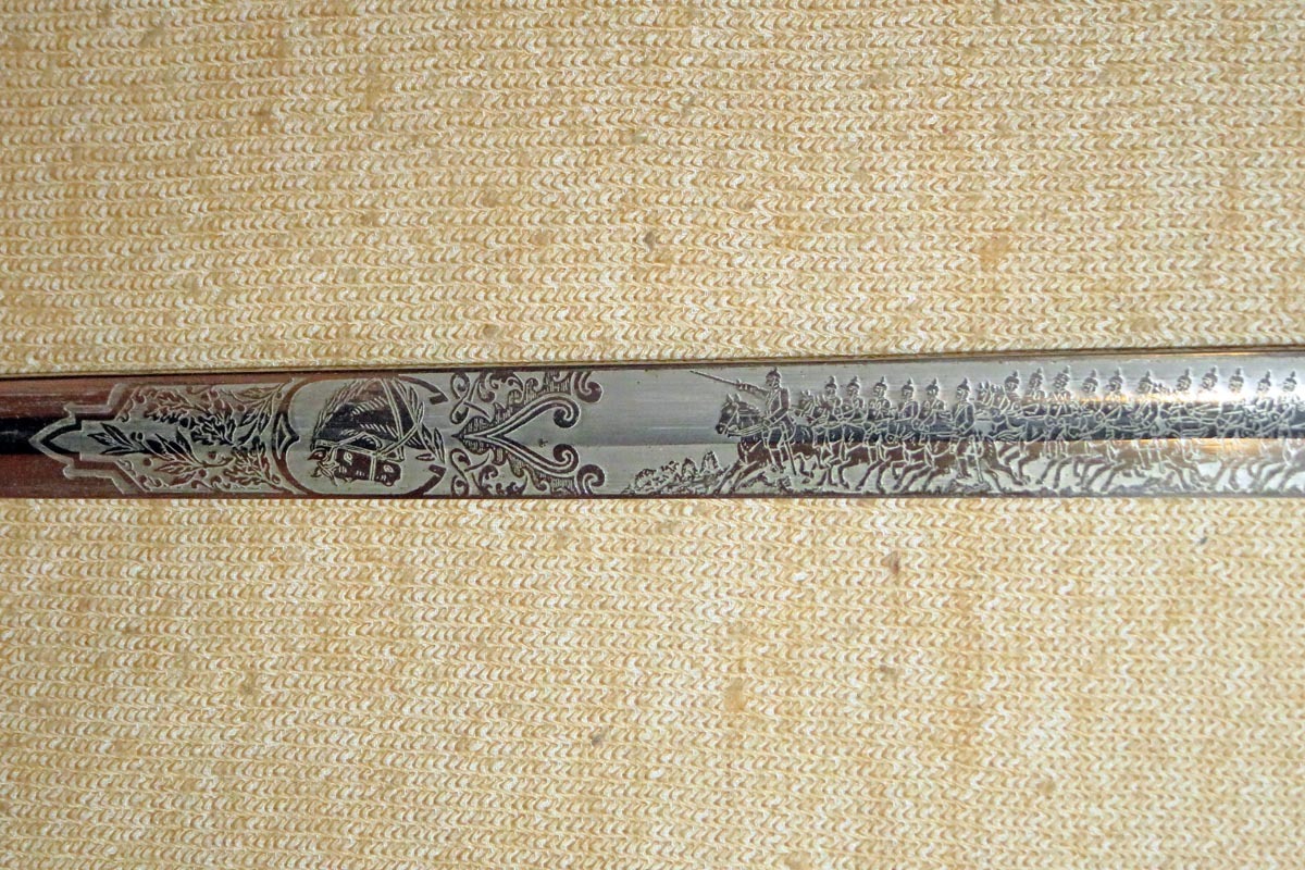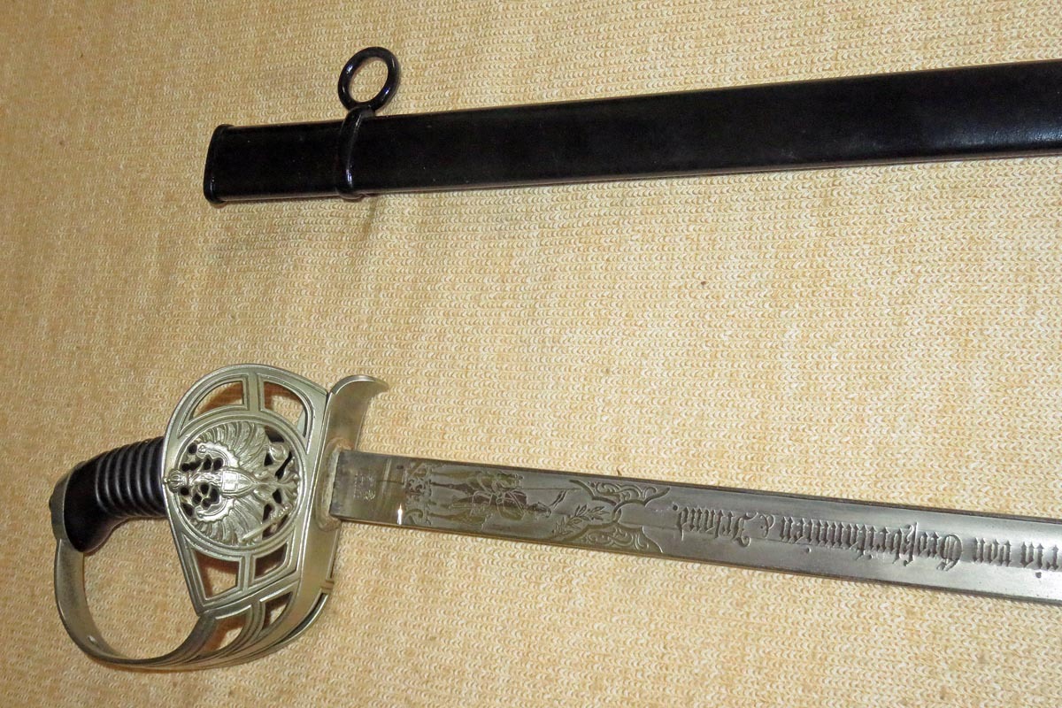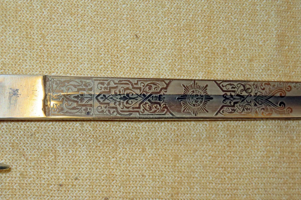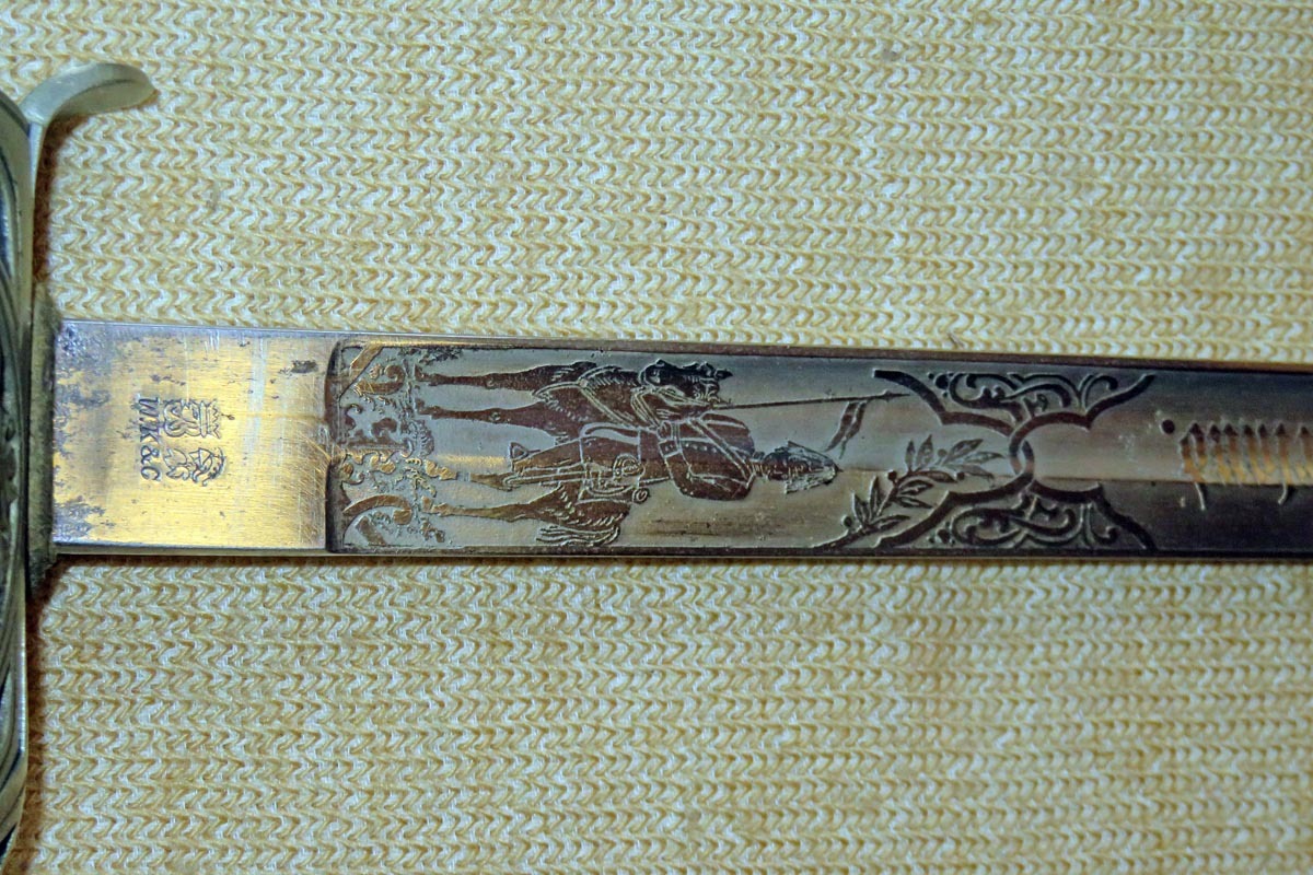 Der Kavallerie Degen hat auf der gut erhaltenen Klinge eine beidseitig reiche Ätzung mit der Inschrift des 1. Garde Dragoner Regiments „1.G.D.Rgt. Königin Victoria von Großbritannien & Irland“ und die Herstellerbezeichnung „W.K.&C.“.