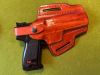 Großes Gürtelholster im “Pancake“- Format, aus hochwertigem, formstabilen Braunleder, Rechtshand, offen am Lauf, mit einem abtrennbaren Druckknopfverschluss der den schnellen Umbau auf reinen Schnellzieher ermöglicht. Die Gürtelschlitzen, hier auf der Rückseite sichtbar