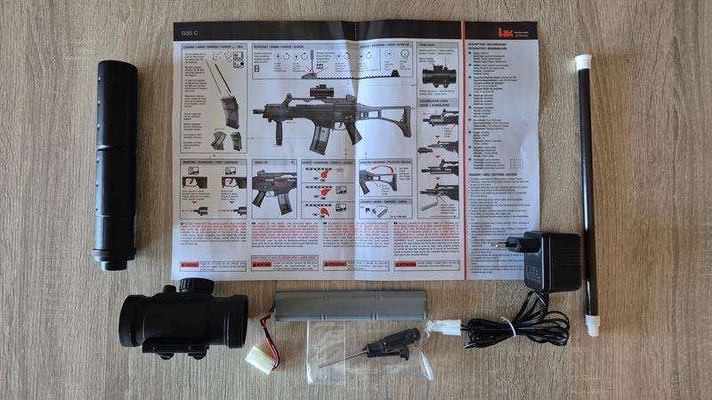 Mehrere Picatinny-Schienen gewährleisten eine leichte Montage von Optik und Zubehör. Full-Auto. Im Lieferumfang enthalten sind Akku (Ni-MH / 7,2 V), Ladegerät, Leuchtpunktvisier, Schalldämpferattrappe, Empfohlen werden Kugeln mit einem Gewicht von 0,20 g.