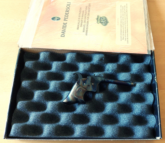 Zum Verkauf kommt hier: Ein neuer Rider Derringer der Firma Davide Pedersoli im Kaliber 4,5mm. Der Derringer wird ausschließlich über ein Vorderlader Zündhütchen betrieben und ist in Deutschland frei ab 18 Jahren (Altersnachweis erforderlich) weitere Daten siehe Internet. Weitere Details s. Bilder! KEIN VERSAND INS AUSLAND!! Anfragen aus dem Ausland/EU werden nicht mehr beantwortet und Bieter werden umgehend gesperrt! (Aufgrund einiger schlechten Erfahrungen ist dieses leider erforderlich! Lieferung / Rechnungsanschrift NUR innerhalb der BRD!! Der Versand erfolgt nach Zahlungseingang an Sie !! Keine Abholung möglich! Gemäß § 19 UStG erheben und weisen wir keine Umsatzsteuer aus (Kleinunternehmerstatus).ACHTUNG!! VERSENDE NICHT INS AUSLAND AUCH NICHT IN ANDERE EU-LÄNDER!!!!Anfragen zwecklos!! Die angegebene Versandkosten stehen fest und sind NICHT verhandelbar! Wem das nicht passt, bitte hier NICHT bieten!! BITTE BEACHTEN!!! KEIN VERSAND INS EU/AUSLAND!!! Bei dem ersteigern von mehreren Artikeln können sich die Versandkosten aufgrund eines evtl. Höheren Paket Gewicht erhöhen.