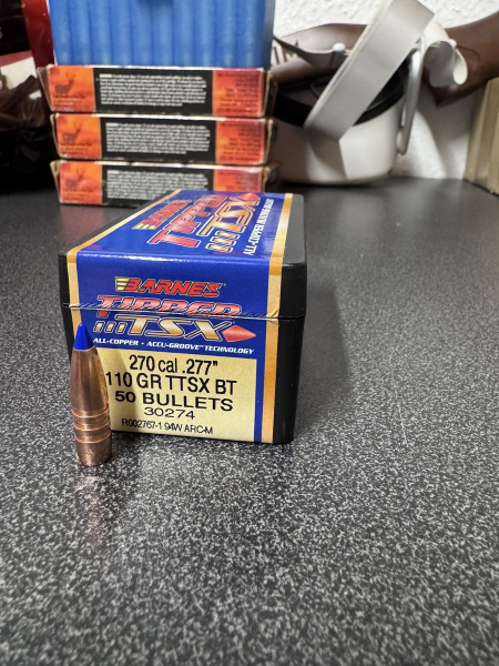 zur Versteigerung kommen 25 Barnes TTSX Geschosse 110 grs Masse im Kaliber 270/277. Die Geschosse wurden schonend gezogen und zeigen keine präzisionsmindernden Spuren (siehe Foto).