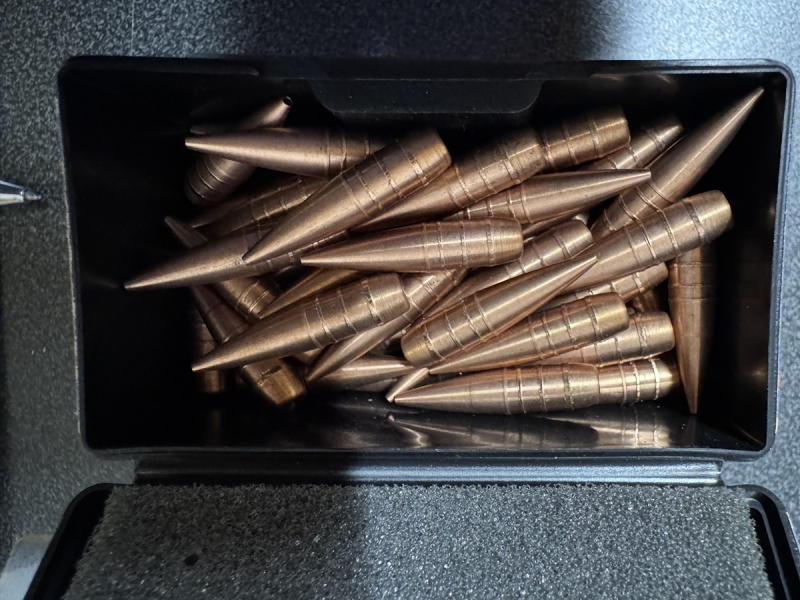 zur Versteigerung kommen 135 original Lutz Möller KJG Geschosse 106,5 grs Masse im Kaliber 270/277. 45 Geschosse wurden schonend gezogen und zeigen keine präzisionsmindernden Spuren (siehe Foto), 90 Stück wurden nie verladen.