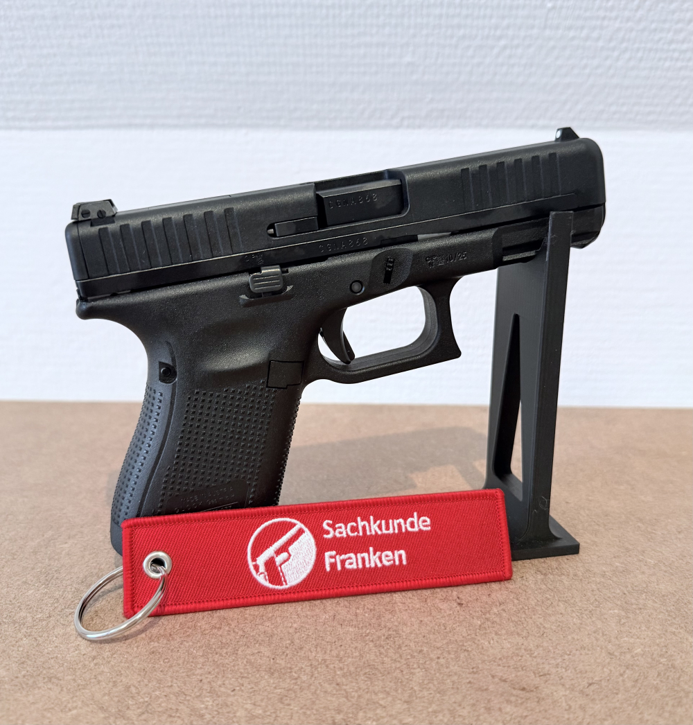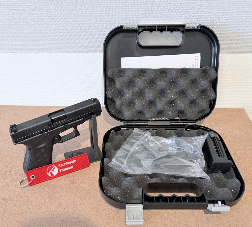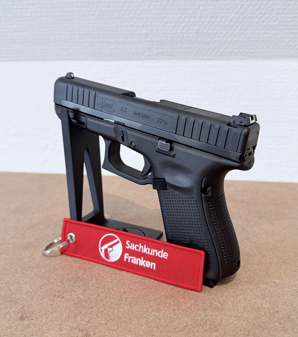 Lieferumfang: 1x Glock 44 im Kaliber .22lr 1x Glock-Waffenkoffer 1x Anleitung 1x Reservemagazin (also in Summe zwei Magazine) 1x Putzstock und Reinigungsbürste 2x Griffrücken 1x Sachkunde Franken Safety Flag & Patch