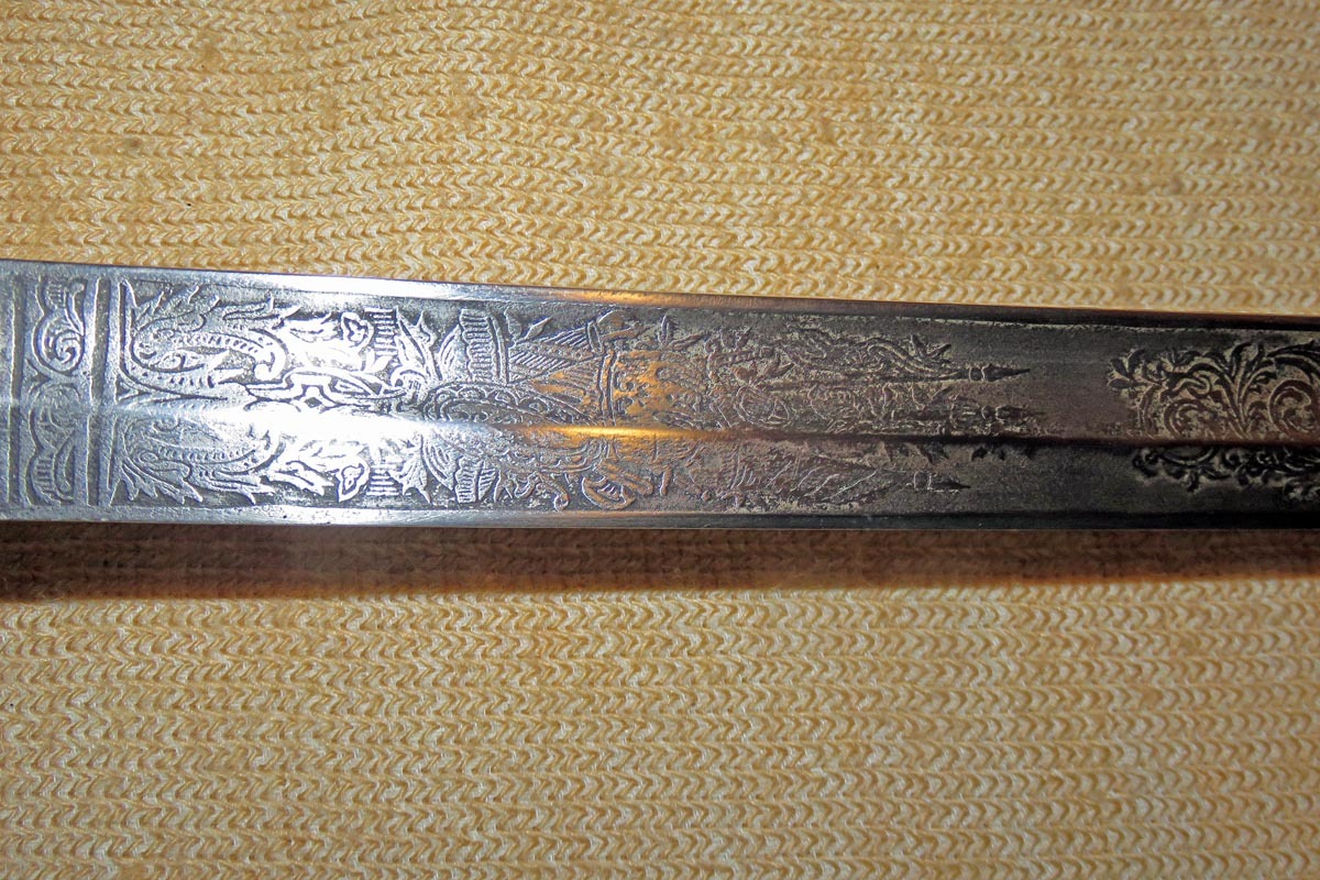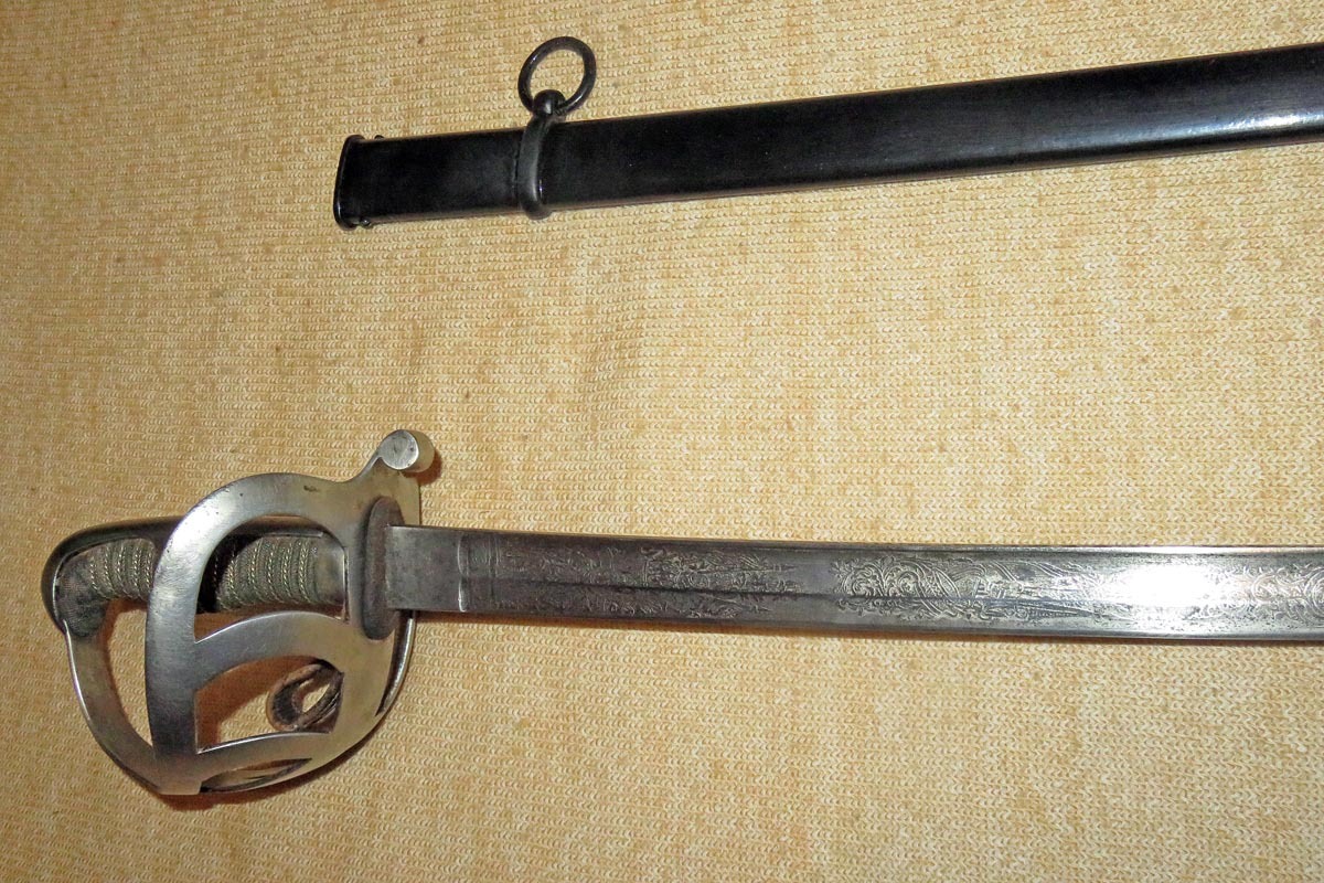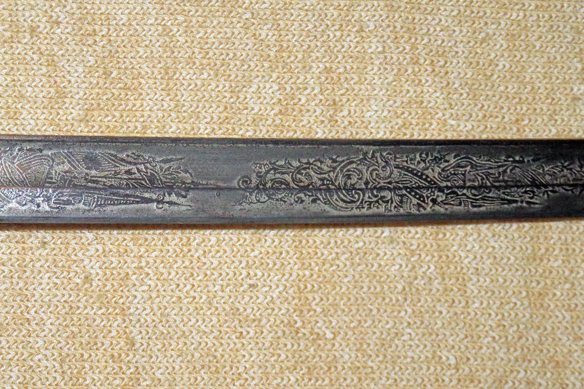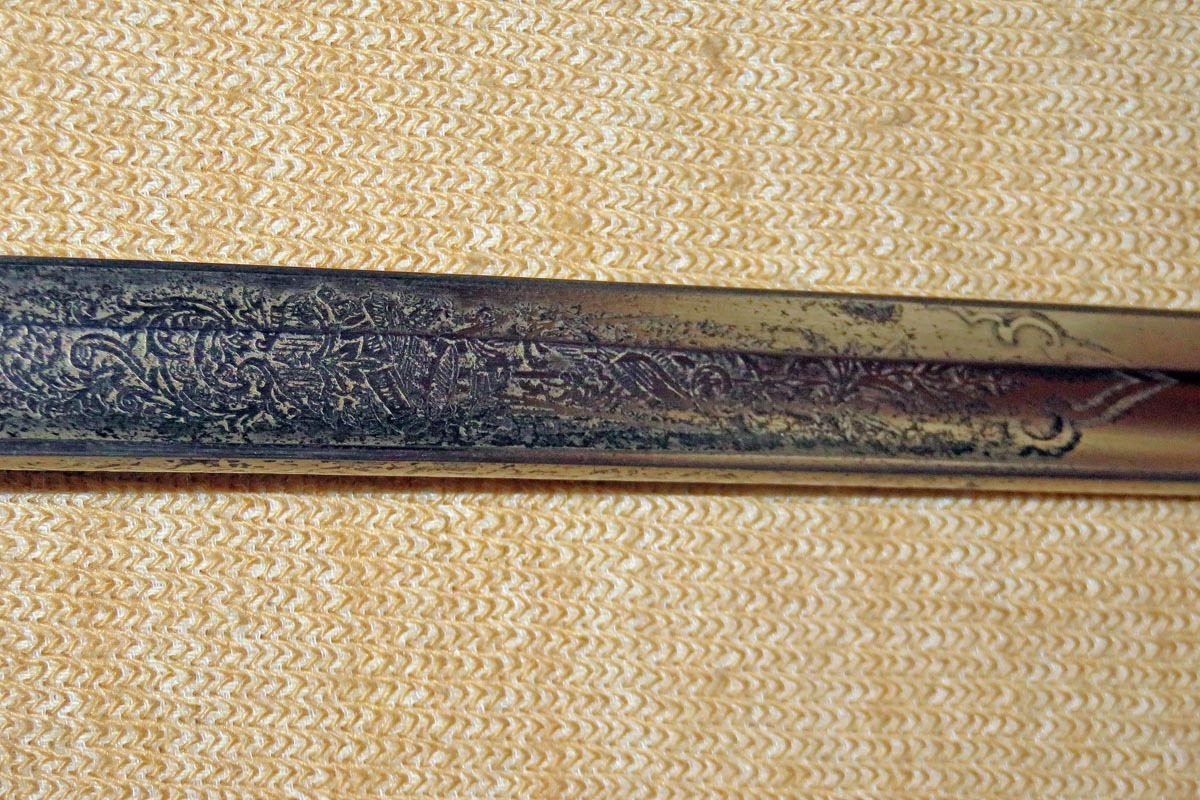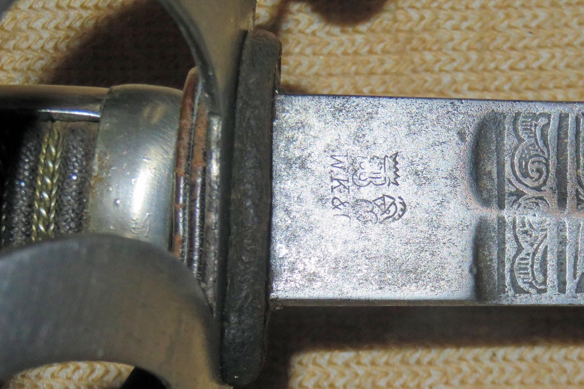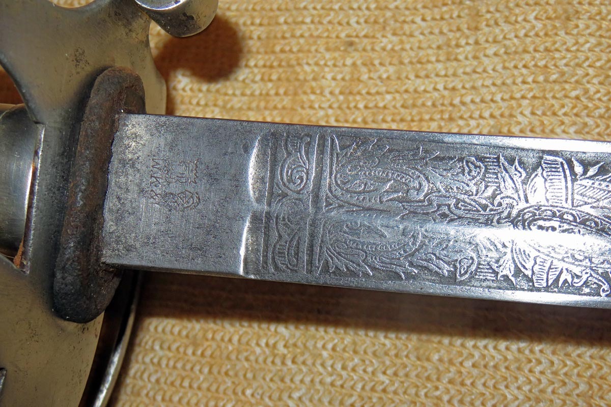 Bei diesem Säbel der preußischen Kavallerie ist die Klinge beidseitig geätzt und mit der Klingenmarke „WKC“ versehen.