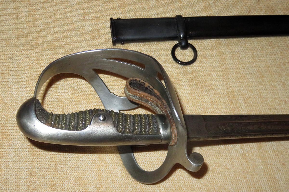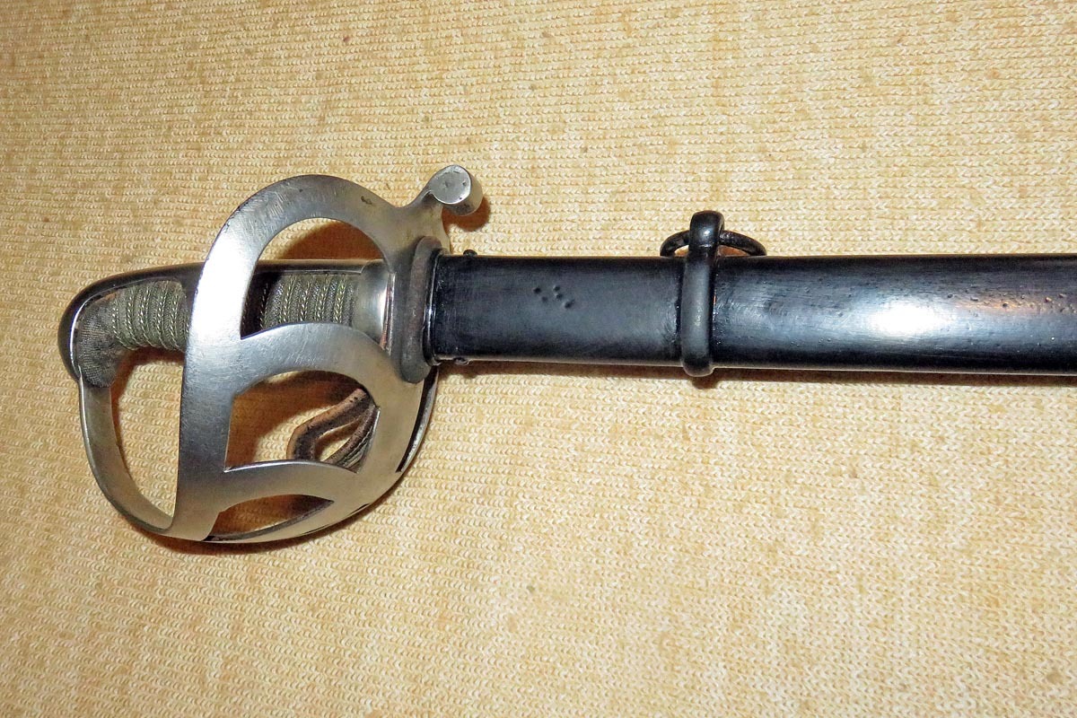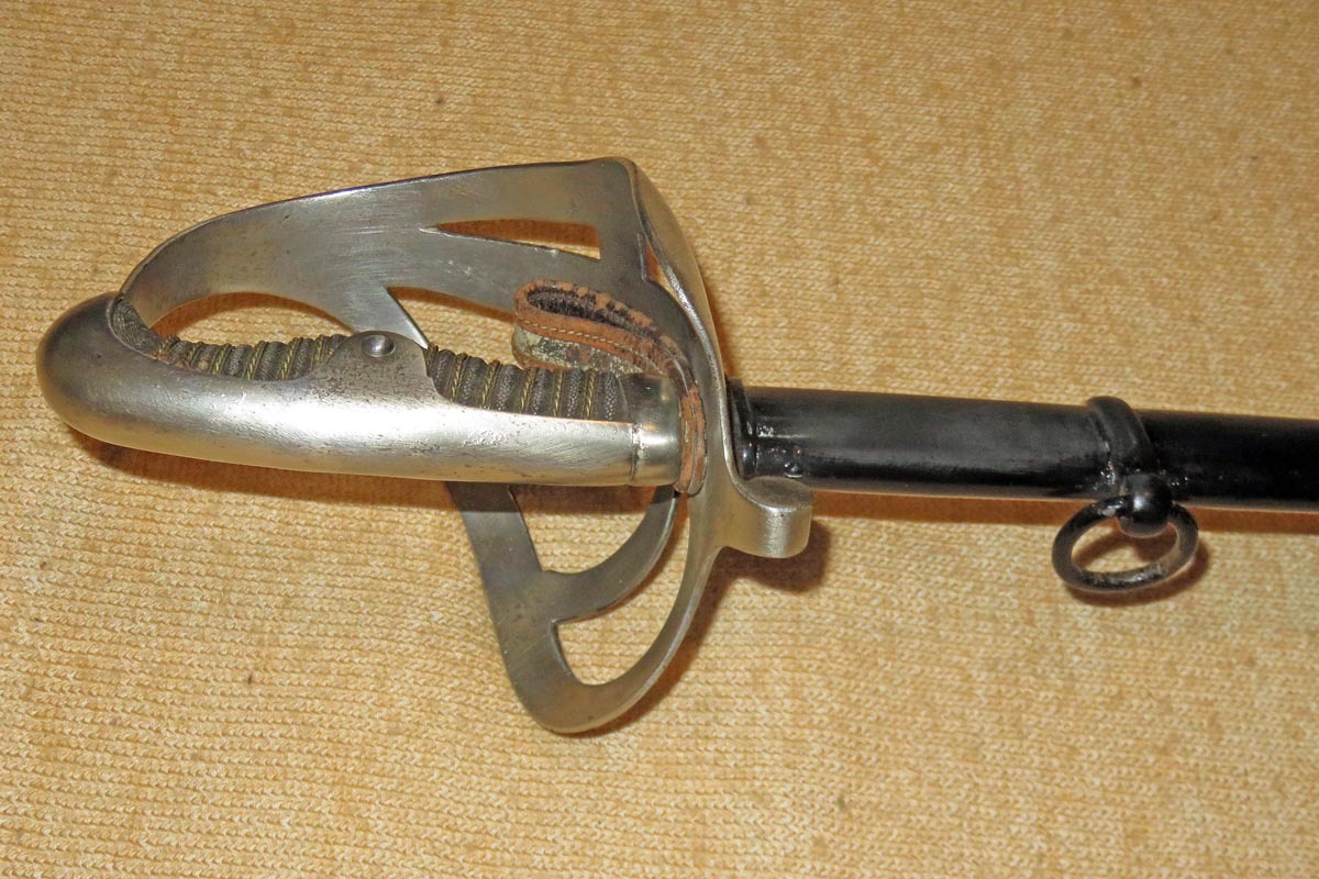 Das Eisengefäß ist vernickelt und der Griff mit Fischhautbesatz und intakter Wicklung, mit Fingerschlaufe.