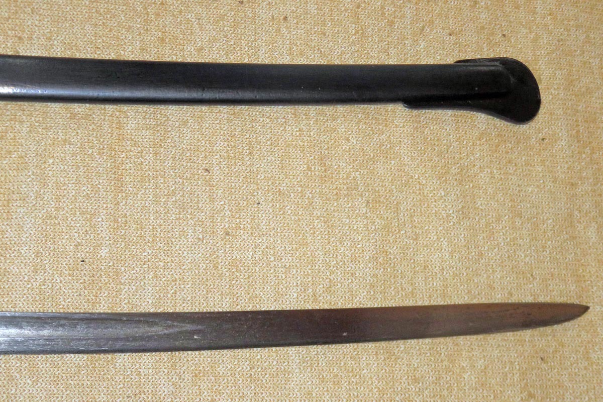 Mit leichten Gebrauchsspuren, die Scheide ist nachlackiert und die Klinge leicht fleckig.