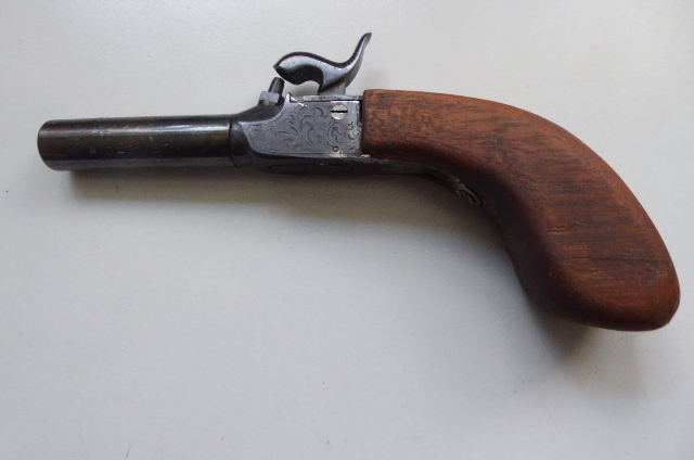 Biete aus meiner Sammlung einen Nachbau von Petersoli an. Vorderlader Derringer Mod. Liegi Kal. 44 mm an. Der Vorderlader hat einen einklappbaren Abzug, nur wenn er gespannt wird, klappt der Abzug heraus. Verschiedene Beschusszeichen vorhanden, siehe die Bilder.