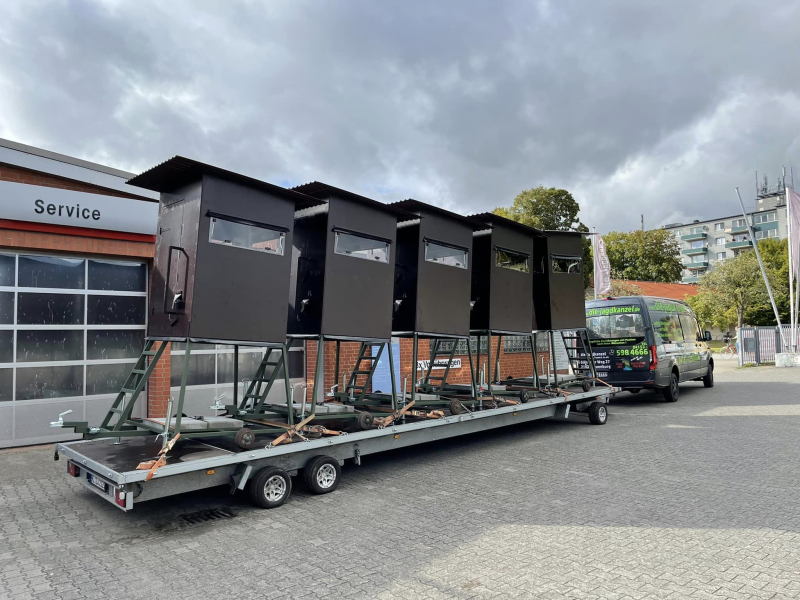 Alle unsere Jagdkanzeln, können komplett mit Jagdkanzel - fest stehendem Bockgerüst oder mit fahrbarem Gestell problemlos mit einem Frontlader in Ihrem Revier umher gefahren werden, das ermöglichen unsere Standards, der massiven und sicheren Bauweise!