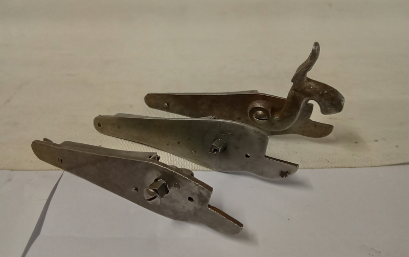 3 rechte Perkussionschloße, rückliegende Federn, baugleiche Rohlinge aus Lütticher Heimarbeit,1 Schloss komplett,1 Schloss ohne Hahn,1 Schloss ohne Hahn und Hahnschraube, Länge 125mm. Privatverkauf, daher keine Garantie oder Gewährleistung, what You see is what You get..